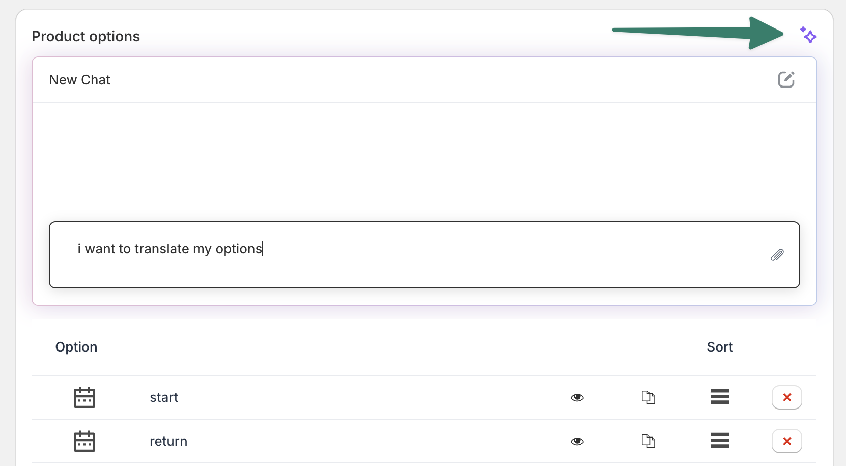 The Product Options AI Assistant can help you translate your product options by automatically extracting the text and replacing them with keys that point to the localized translations.