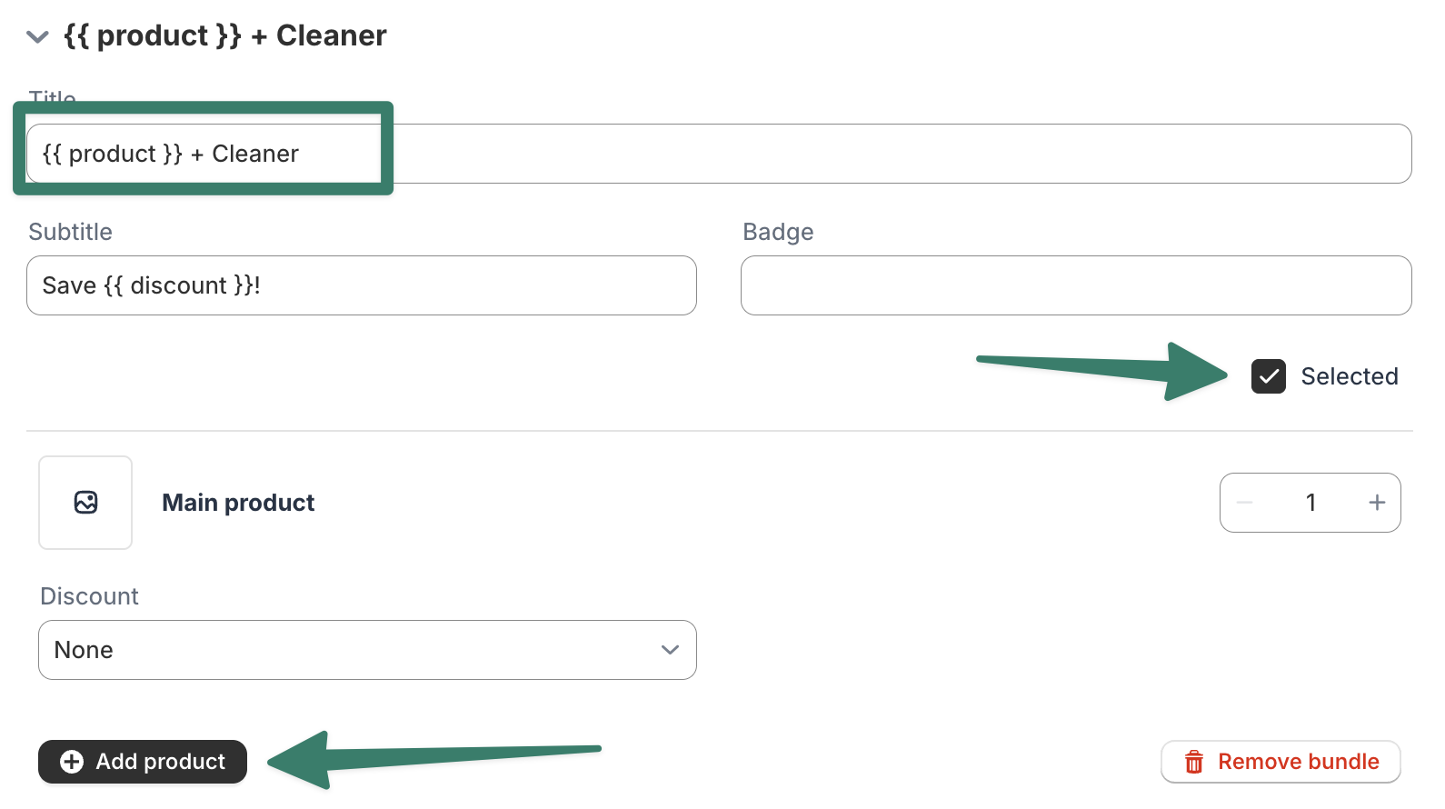You can give the bundle a different title (also shown in the Checkout) and mark the bundle as pre-selected. Next, click on Add product to add more products in the bundle: