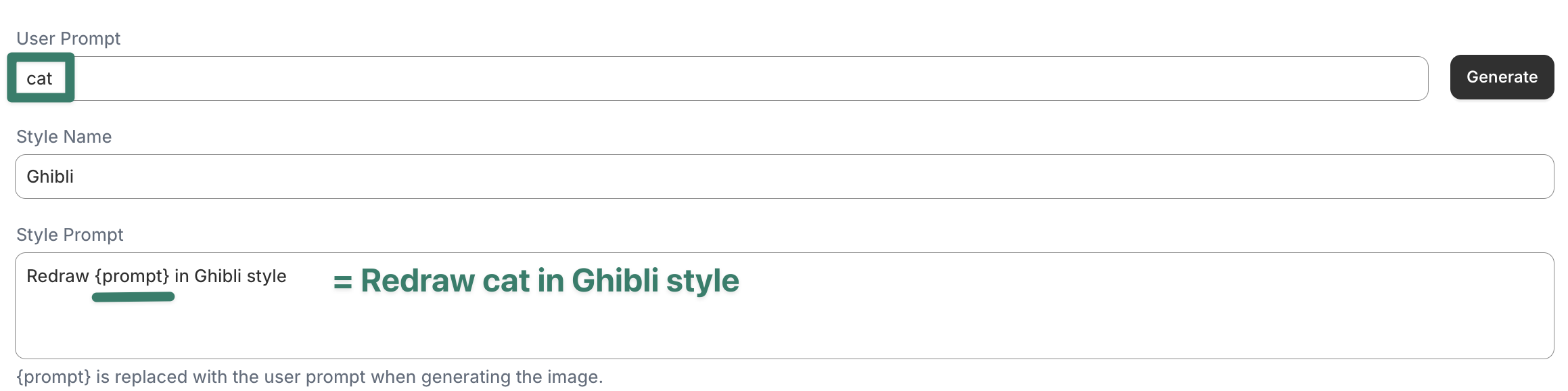 Note: AI prompt is not private, it can be inspected in the browser console. AI Prompt can be combined with AI styles to keep the style prompt private and only include the customer’s input in the AI prompt input.