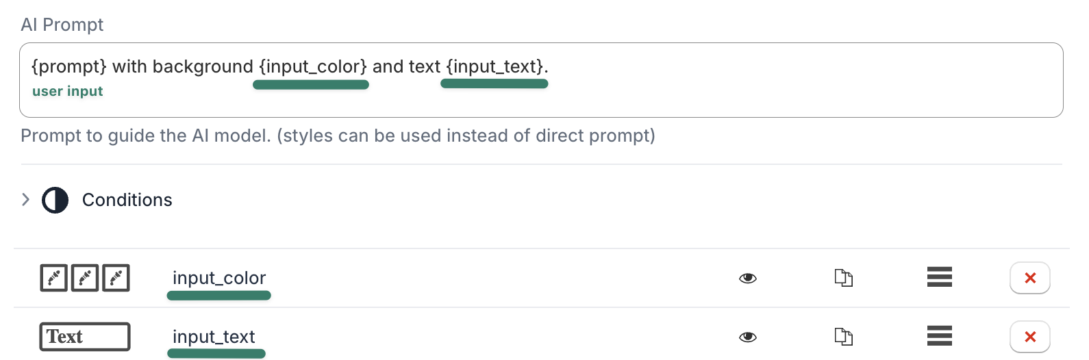 The AI prompt setting directly on the AI option can be used to generate the final user prompt on the client side (in the browser). The prompt has access to other option values by using the {name} placeholder. This allows to generate a dynamic prompt input for more advanced use cases: