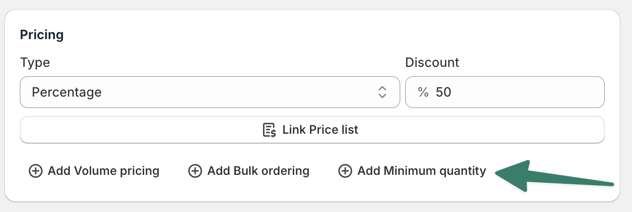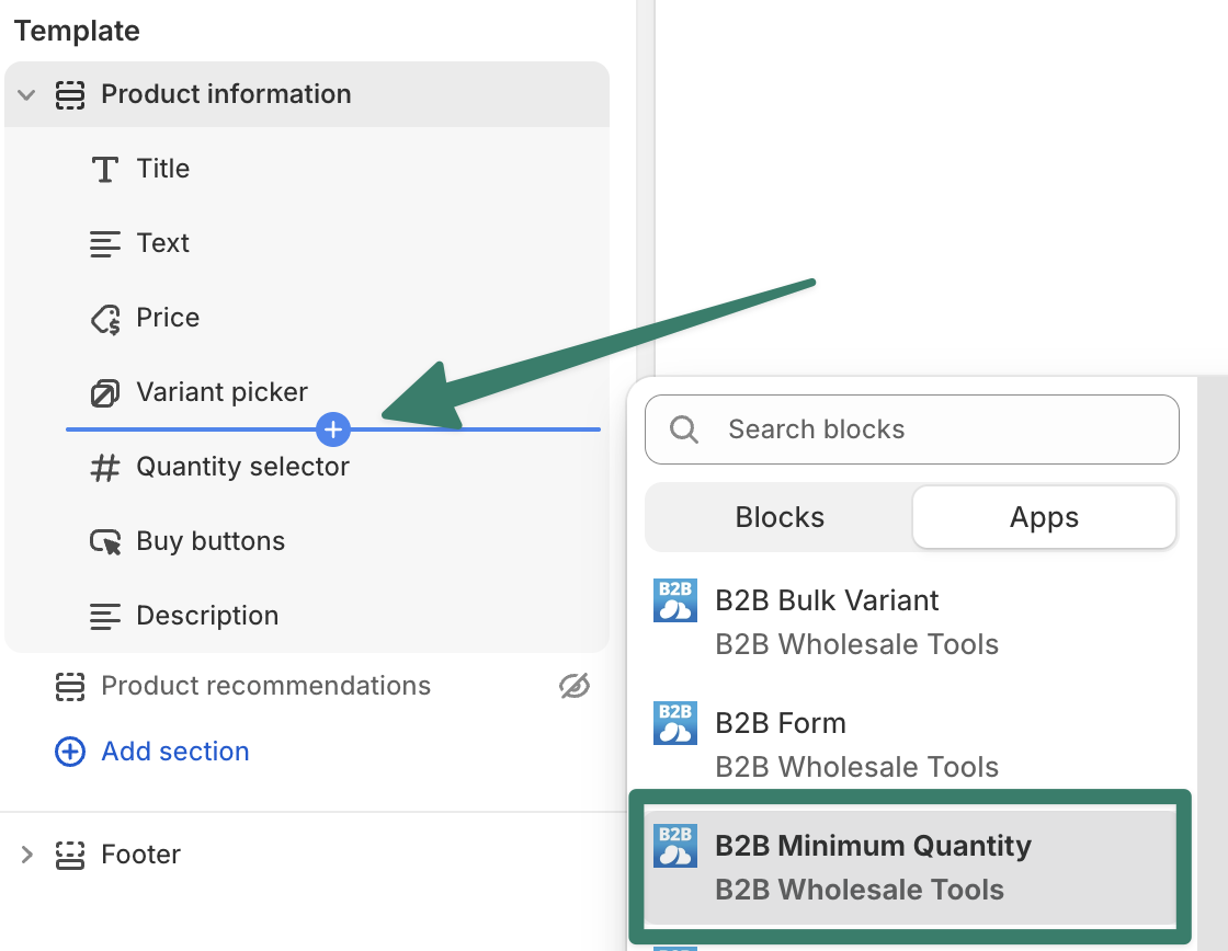 To show the minimum quantity validation on your store, open the Theme editor and navigate to the Product template. There you can add the app block for the B2B Minimum Quantity: