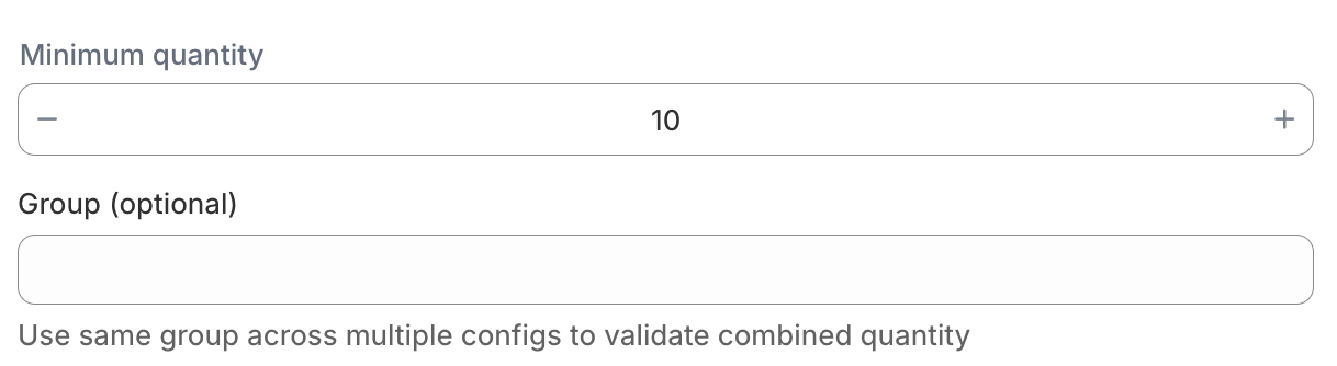 The group setting can be used to calculate the total quantity for all items in the cart. The app will load the cart contents to calculate the min validation. You can also configure the same group on different pricing configurations.