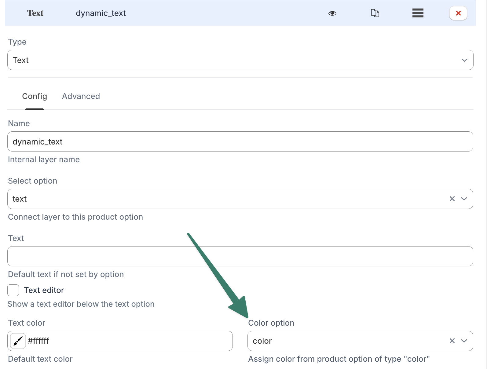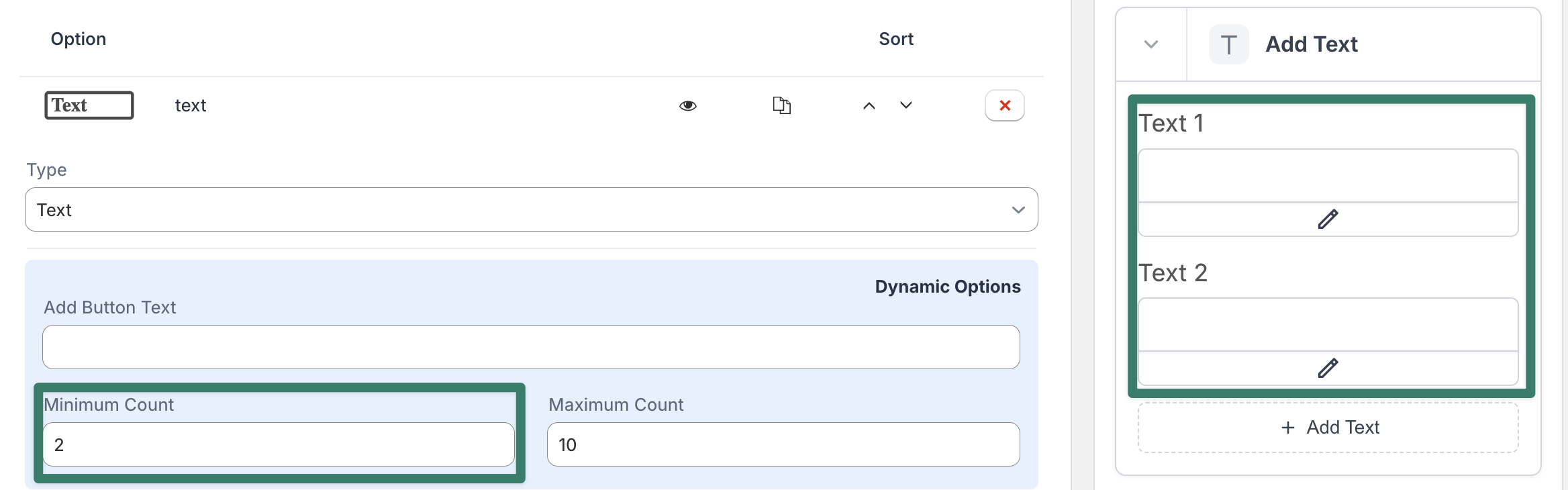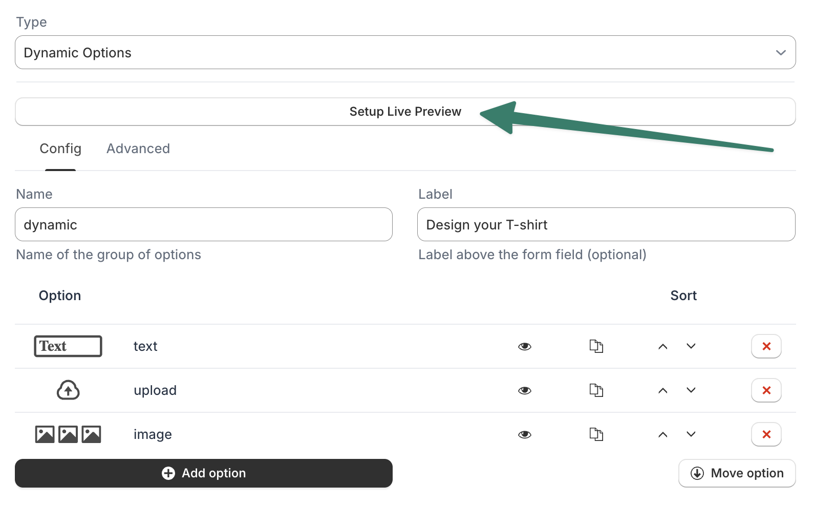 The Dynamic Option type allows customers to add new options when designing the product on the product page. By allowing customers to add/remove options, you can build a more flexible and interactive product customization experience.