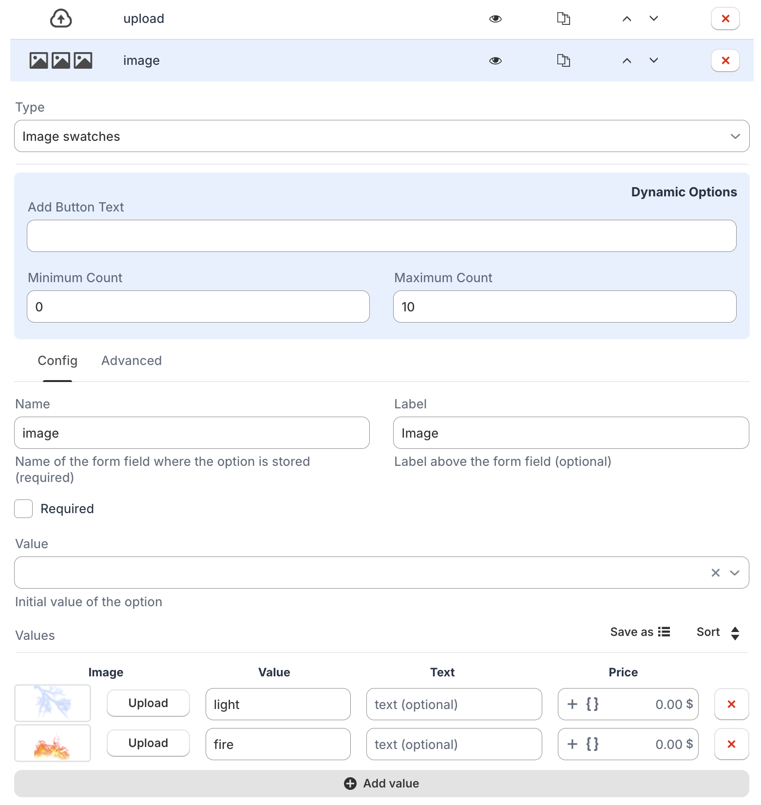 The option will automatically setup two child options, text and upload. You can add additional options as needed: