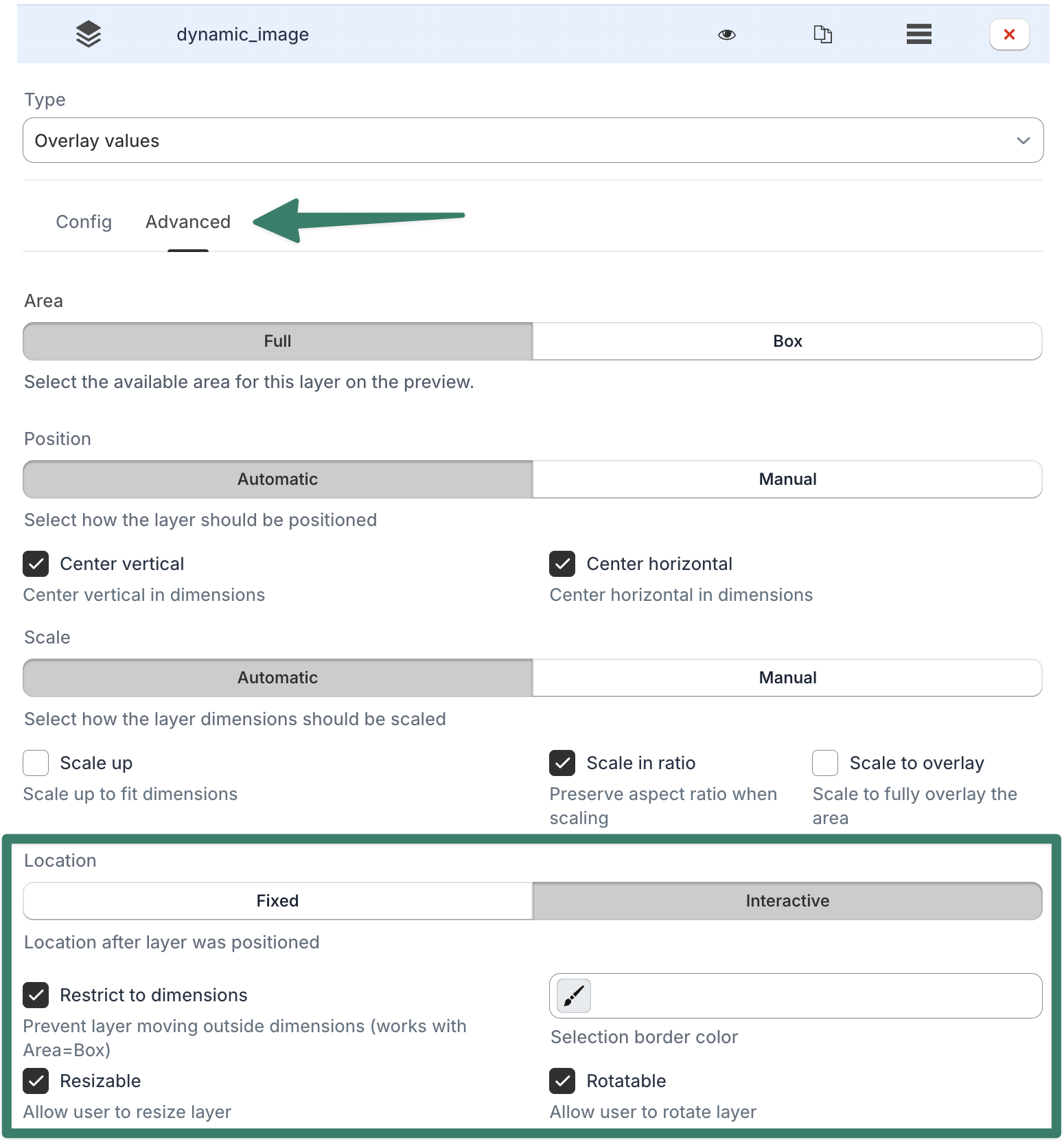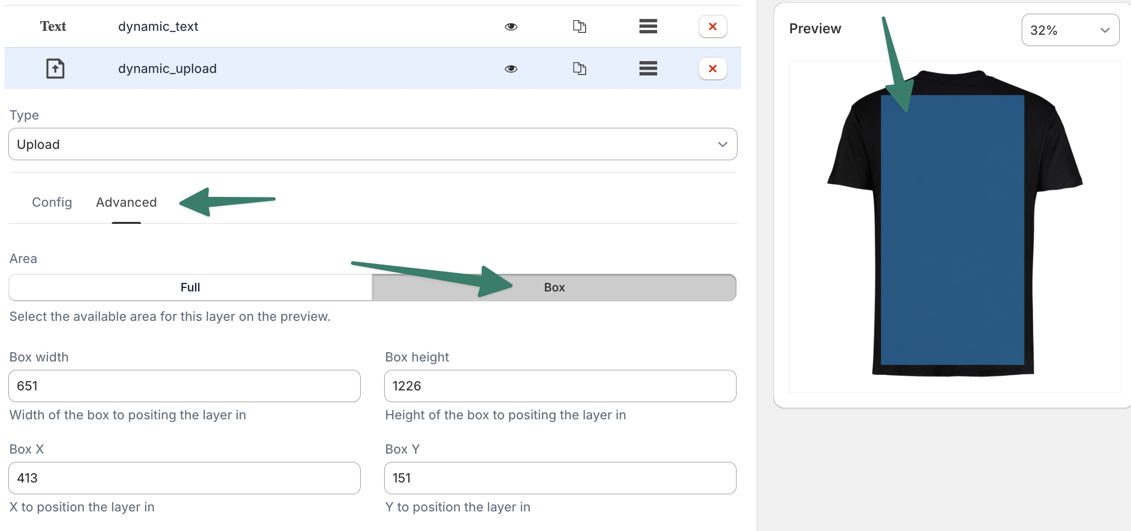 In most cases you want to limit the area where the customer can move around the elements on the preview, for this select the Advanced tab and set the Area to "Box", you can move the blue box around on the preview to set your desired area: