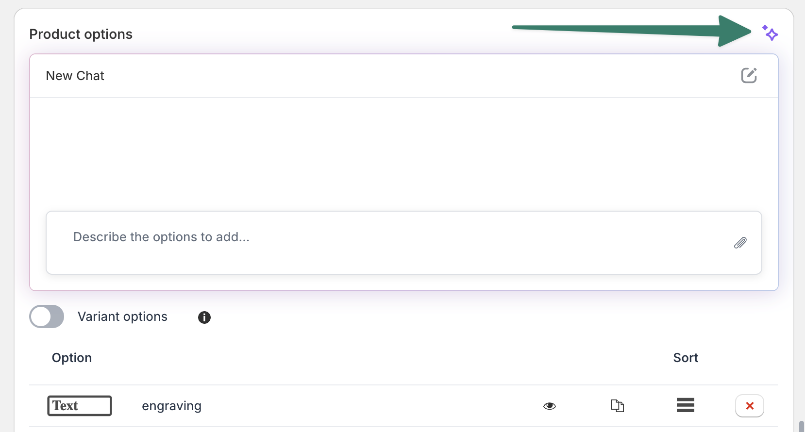 The Live Product Options App has a built in AI-powered assistant to help you with your product options setup. It can understand your requirements and guide you through the process of setting up your product. Each of the following sections has its own AI-powered assistant for specific tasks.