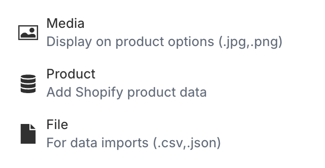 - Use case: Reference images for product options (e.g., color swatches, patterns, designs)
