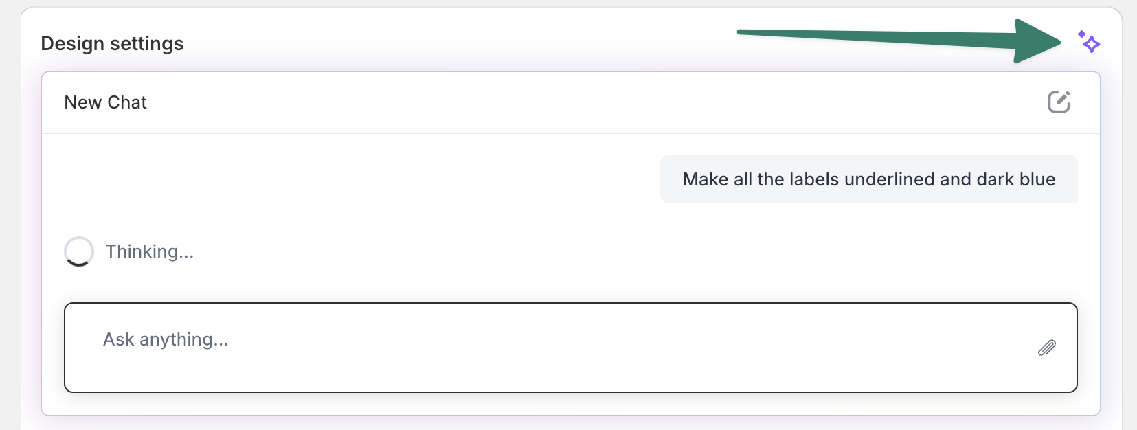 The design AI assistant is specialized in updating the design of your product options based on your description. It can generate custom CSS and even JavaScript for interactivity.