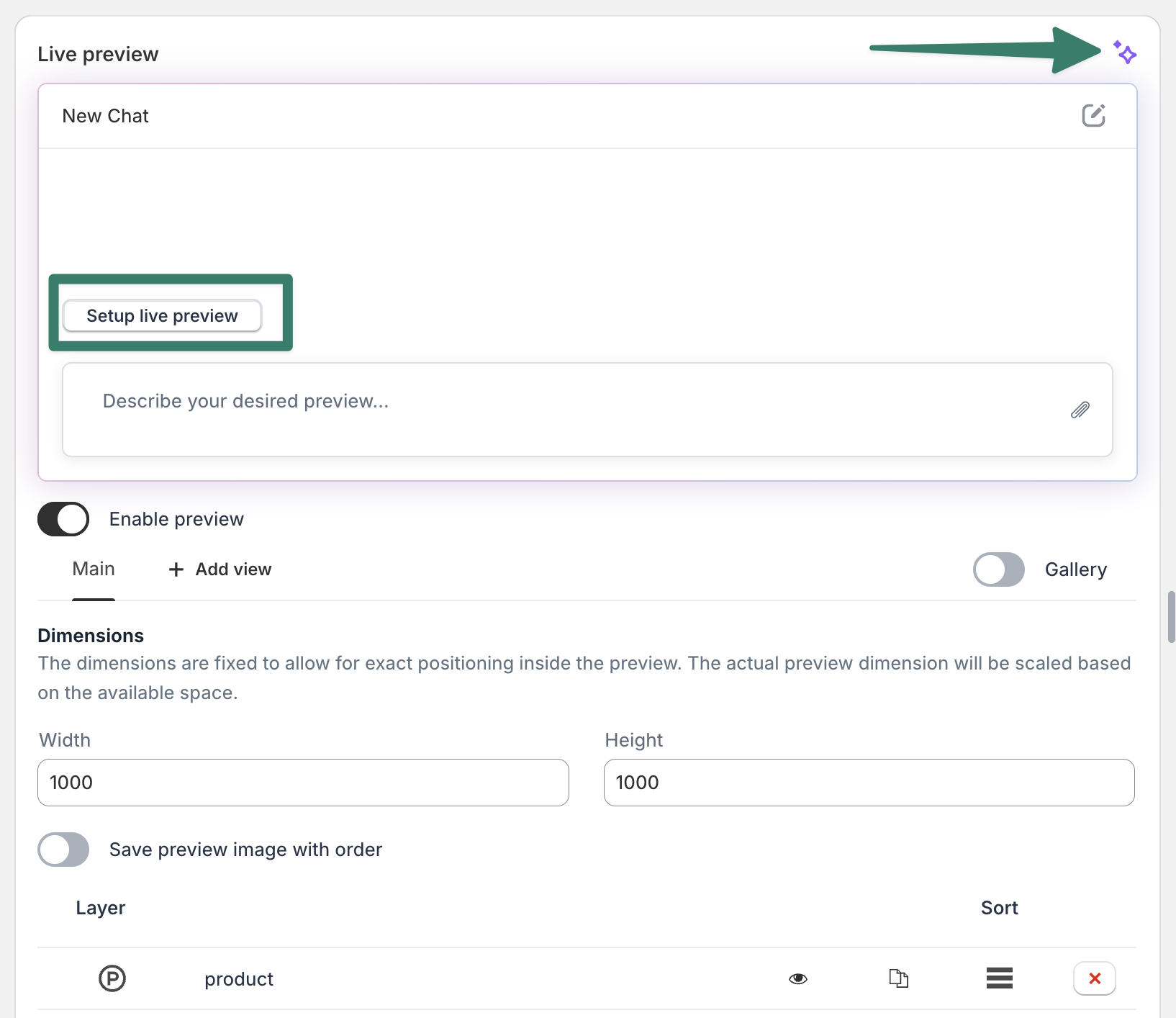 The Live Preview AI assistant is specialized in setting up a preview of your product options based on your existing product and options. To get started, we recommend to use the suggested button for "Setup live preview":