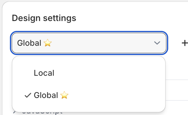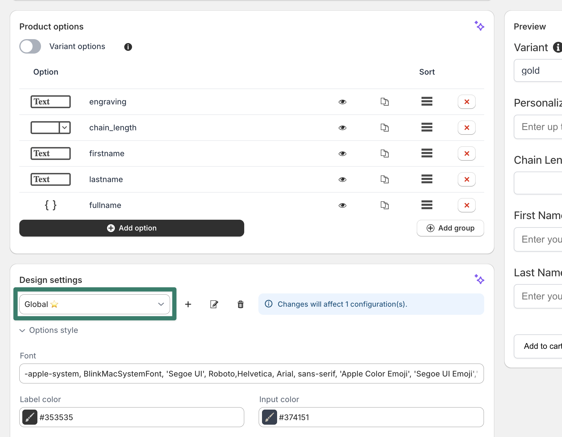 The design settings enable customization of the appearance of each product options configuration. It is possible to edit variables such as colors, fonts, spacing, and more or provide custom CSS and JavaScript to further customize the product options design.