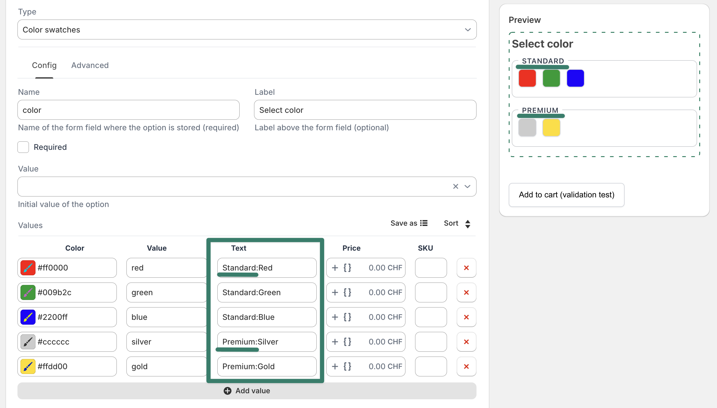 If you have lots of option selections and want to visually group them together, you can configure a prefix on the Text field of each option value. The prefix will be used to visually group the options together: