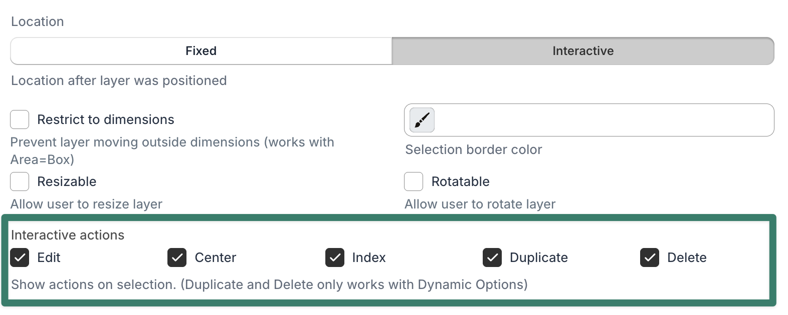 Note: Layers cannot be moved behind or in front of another layer that does not have the interactive Index action enabled. This allows preventing the customer from moving the layer behind a protected layer.